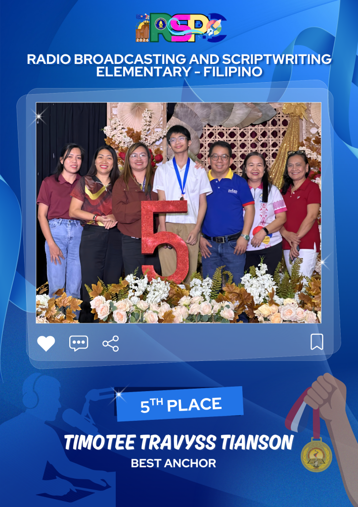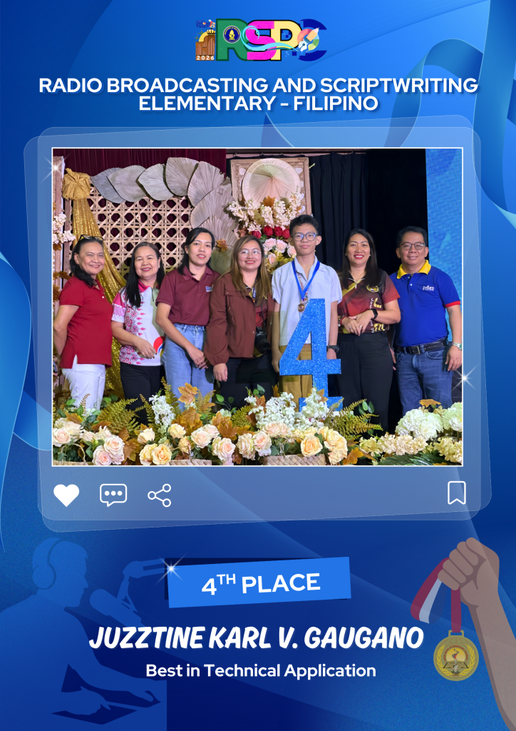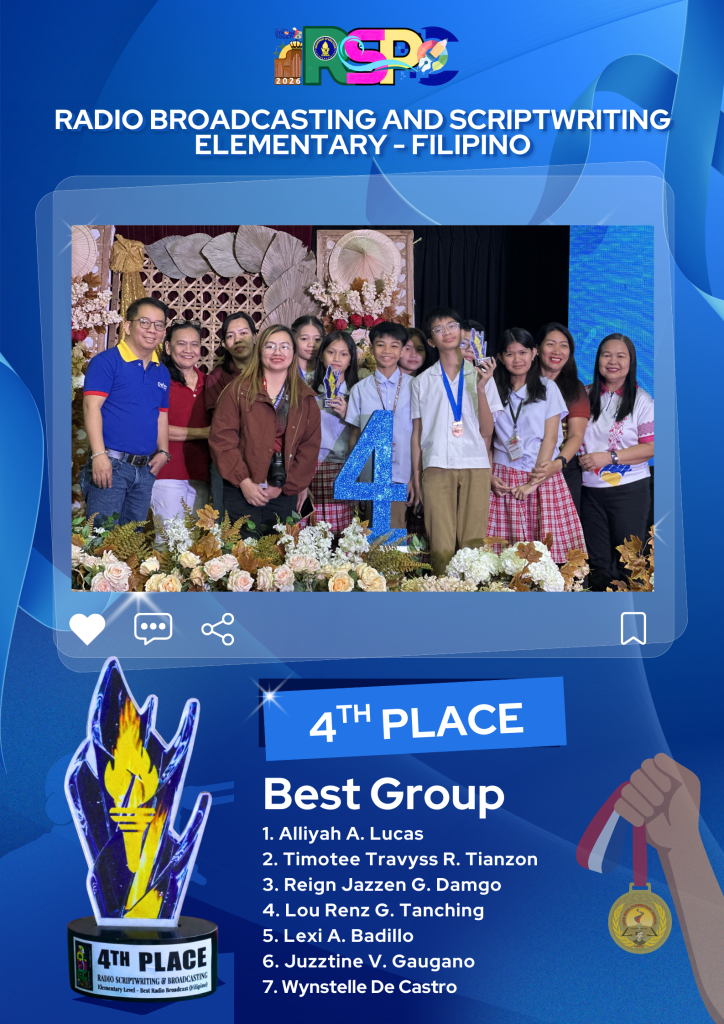 Meanwhile, during the awarding ceremony on March 14, the Radio Broadcasting and Scriptwriting – Filipino Team brought home 4th Place Best Group Overall, 3rd Place Best Script, 5th Place Best Anchor for Timotee Travyss Tianzon and 4th Place Best Technical Application for Juzztine Karl V. Gaugano, trained by Ms. Anely B. Rada, Ms. Daisy C. Cabuyoc and Mrs. Criselda A. Santos.
