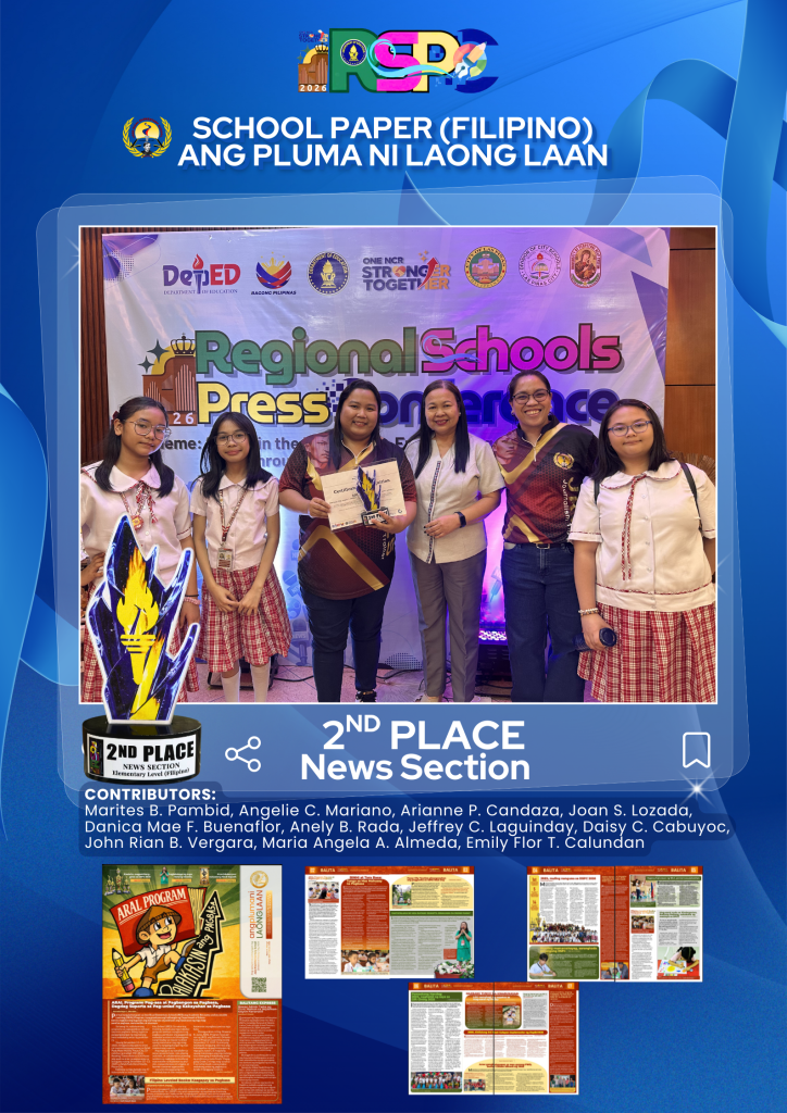With these achievements, ‘Ang Pluma ni Laong-Laan’ will represent the National Capital Region (NCR) at the National Schools Press Conference (NSPC) in Ormoc City, Leyte, scheduled on April 13 – 17, 2026.